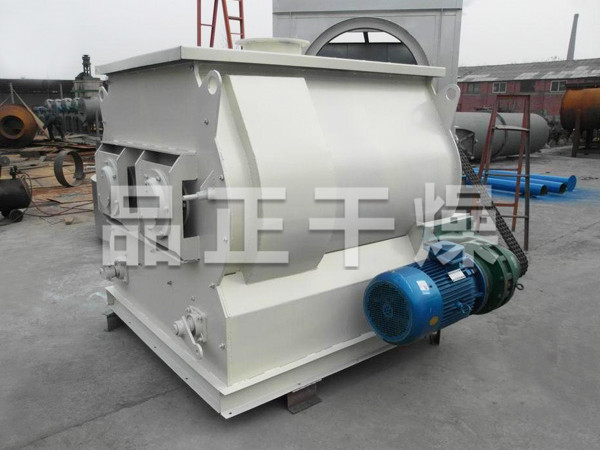 本系列混合機以強烈、高效混合為特點、臥式筒體內(nèi)兩根攪拌等速反向旋轉(zhuǎn),上特殊布置的槳葉確保物料徑向、環(huán)向、軸向三向運動,形成復合循環(huán),在極短的時間內(nèi)達到均勻混合。