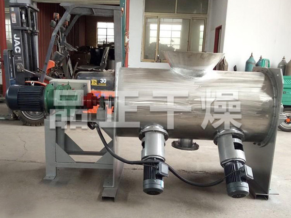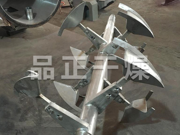 該機型由傳動機構、臥式筒體、犁刀、飛刀四部分組成,物料在犁刀作用下沿筒壁作軸向流支,當物料流經飛刀時被高速度旋轉的飛刀拋灑,從而在較短時間內達到均勻混合。