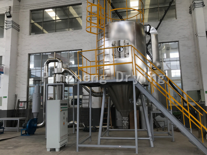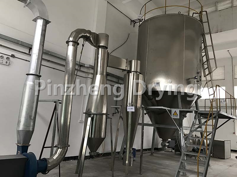 After filtering and heating, the air enters the air distributor at the top of the dryer, and the hot air enters the drying chamber evenly in a spiral shape. The feed liquid passes through the high-speed centrifugal atomizer on the top of the tower body, and (rotating) spray into extremely fine mist like liquid beads, which can be dried into finished products in a very short time in parallel with hot air. The finished product is continuously output from the bottom of the drying tower and the cyclone separator, and the exhaust gas is discharged by the fan.